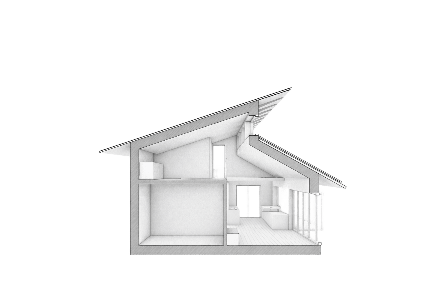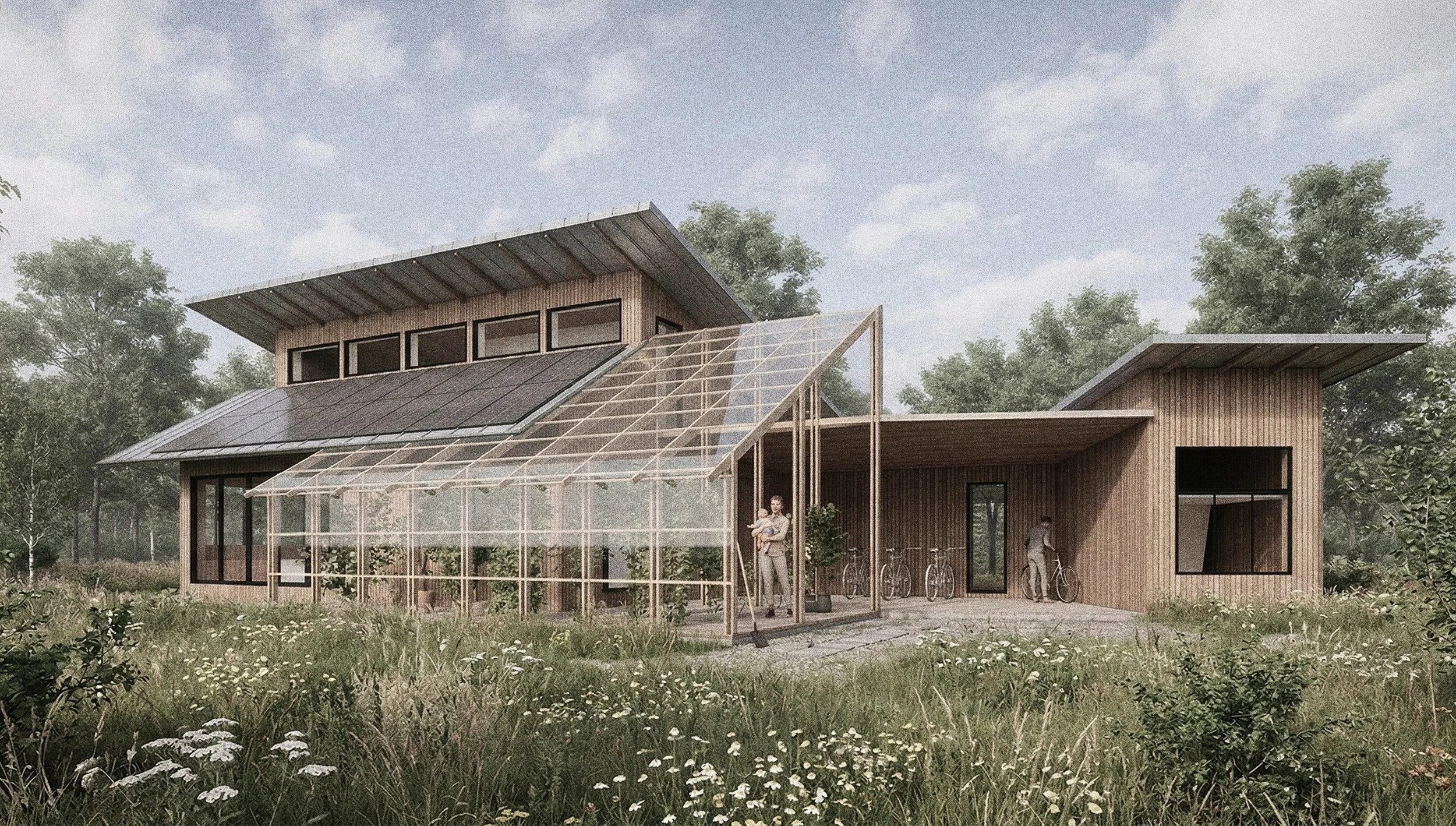 Husets form er ikke tilfældig. Taghældningen er bestemt af solen — vinklet til at indfange den lave vintersol og give passiv varme, mens den samtidig skærmer mod den høje sommersol og forhindrer overophedning. Den samme taghældning er ideel til solceller, så huset producerer sin egen energi på de flader der allerede er der.