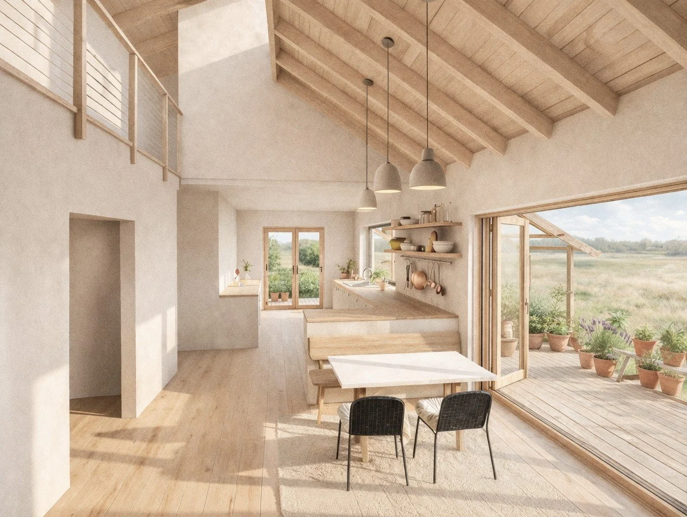 Indvendigt er huset lerpudset. De store, varme overflader akkumulerer dagens varme og afgiver den langsomt — et passivt system der arbejder stille i baggrunden. Strategisk placerede vinduer trækker lyset ind fra ovenlysvinduet og de sydvendte terrassedøre og fordeler det roligt gennem rummene. Ler regulerer fugt og temperatur naturligt og skaber et indeklima der føles sundt og stabilt gennem årets skiftende sæsoner.