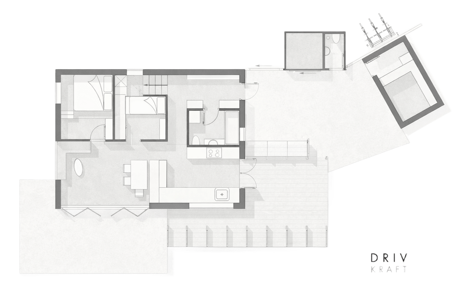 Huset er organiseret efter lyset og privatlivet. De åbne, lyse samlingsrum — køkken, spisestue og stue — vender mod syd og orangeriet. De private rum trækker sig mod nord. Ovenpå ligger kontor og soveværelse med adgang til en tagterrasse, der åbner udsigten og forlænger husets brugbare areal op over tagfladen.