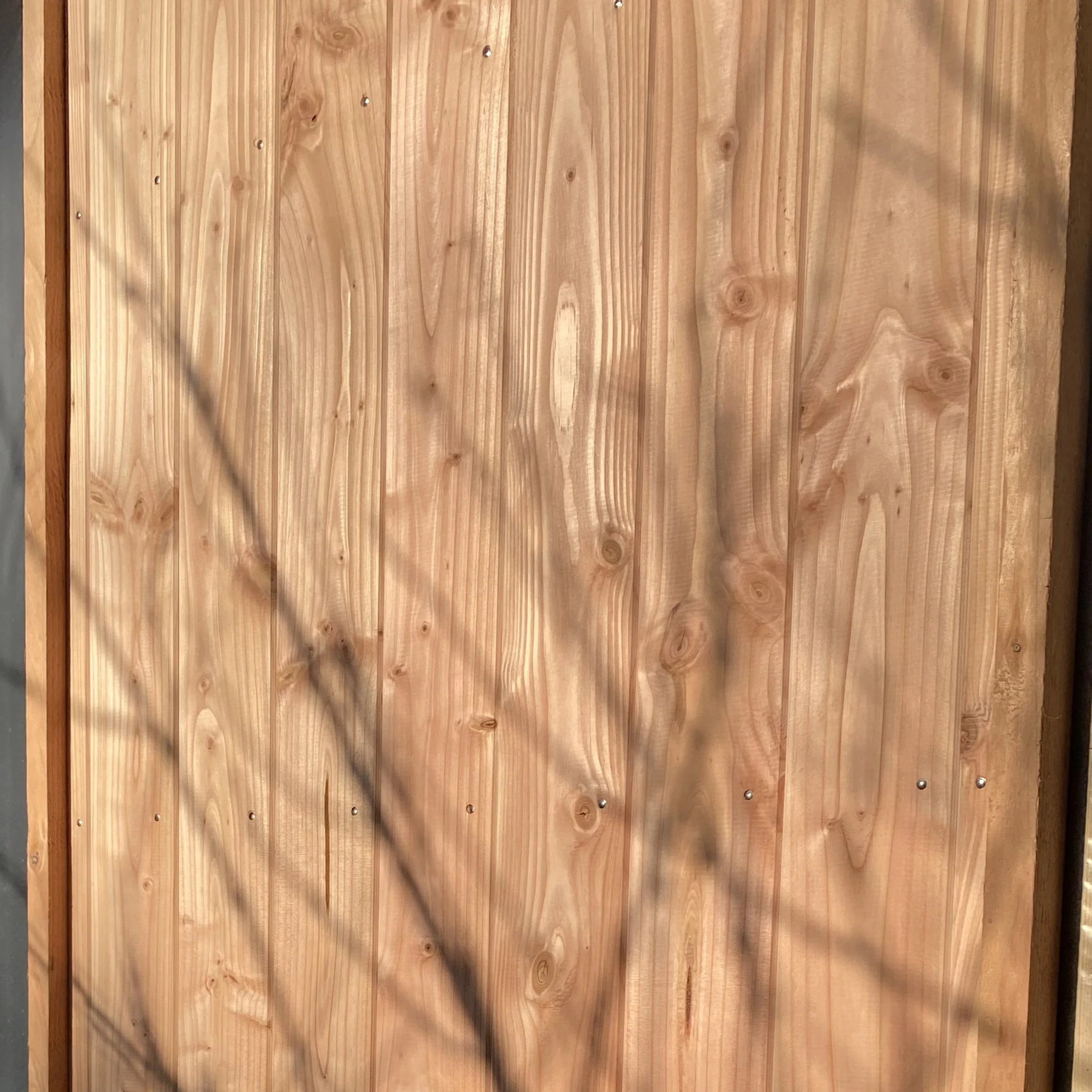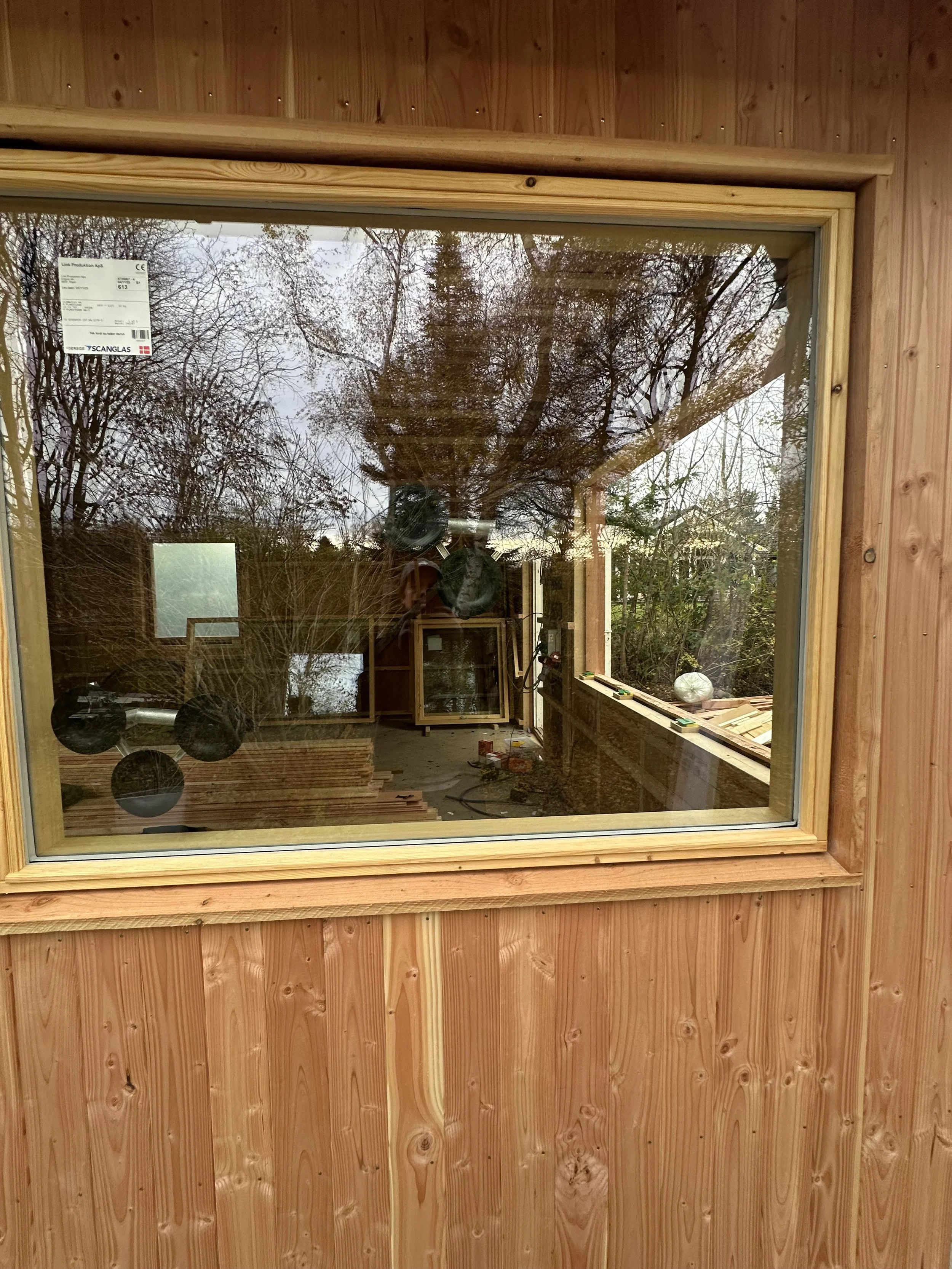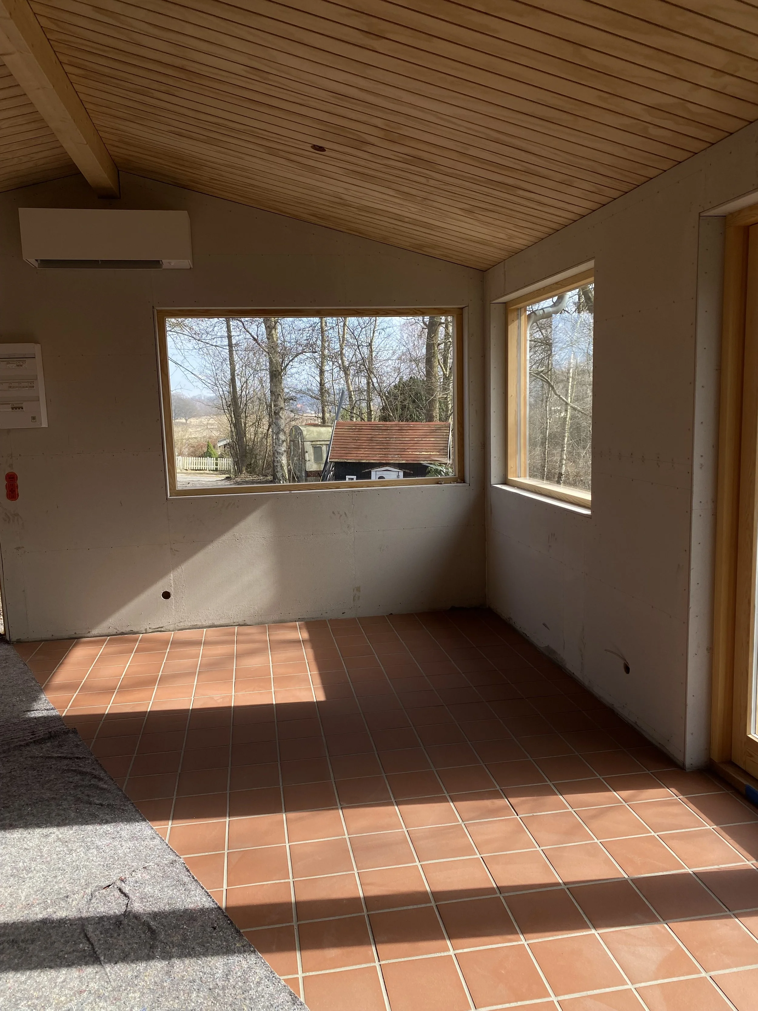 Materialerne er douglasgran på facaden, lerpuds indvendigt, træfiber som isolering og vinduer behandlet med linolie. Rene, ærlige valg med fokus på godt indeklima, taktilitet og holdbarhed.